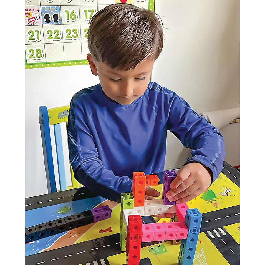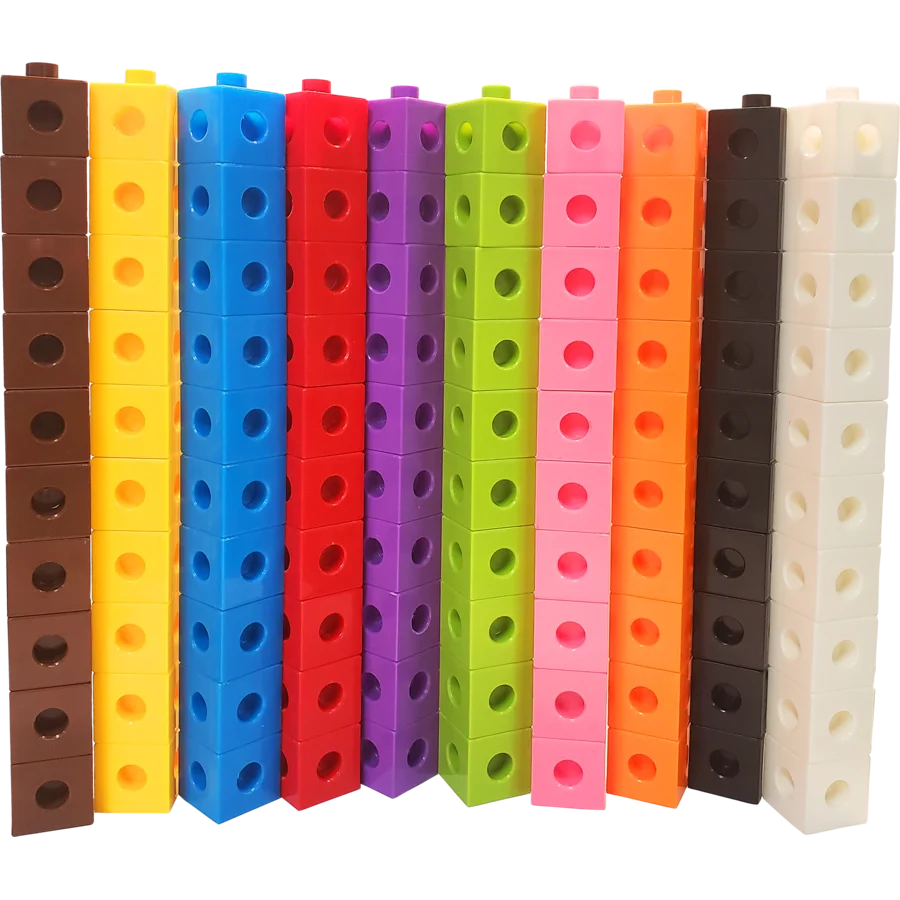 Explore spatial relationships using plastic cubes that link together on all sides. Great for counting, sorting, measuring, and graphing. 100 plastic cubes in 10 colors: 10 each of white, yellow, orange, pink, red blue, green, purple, brown, and black. 3/4" cubes. Includes suggested activities.